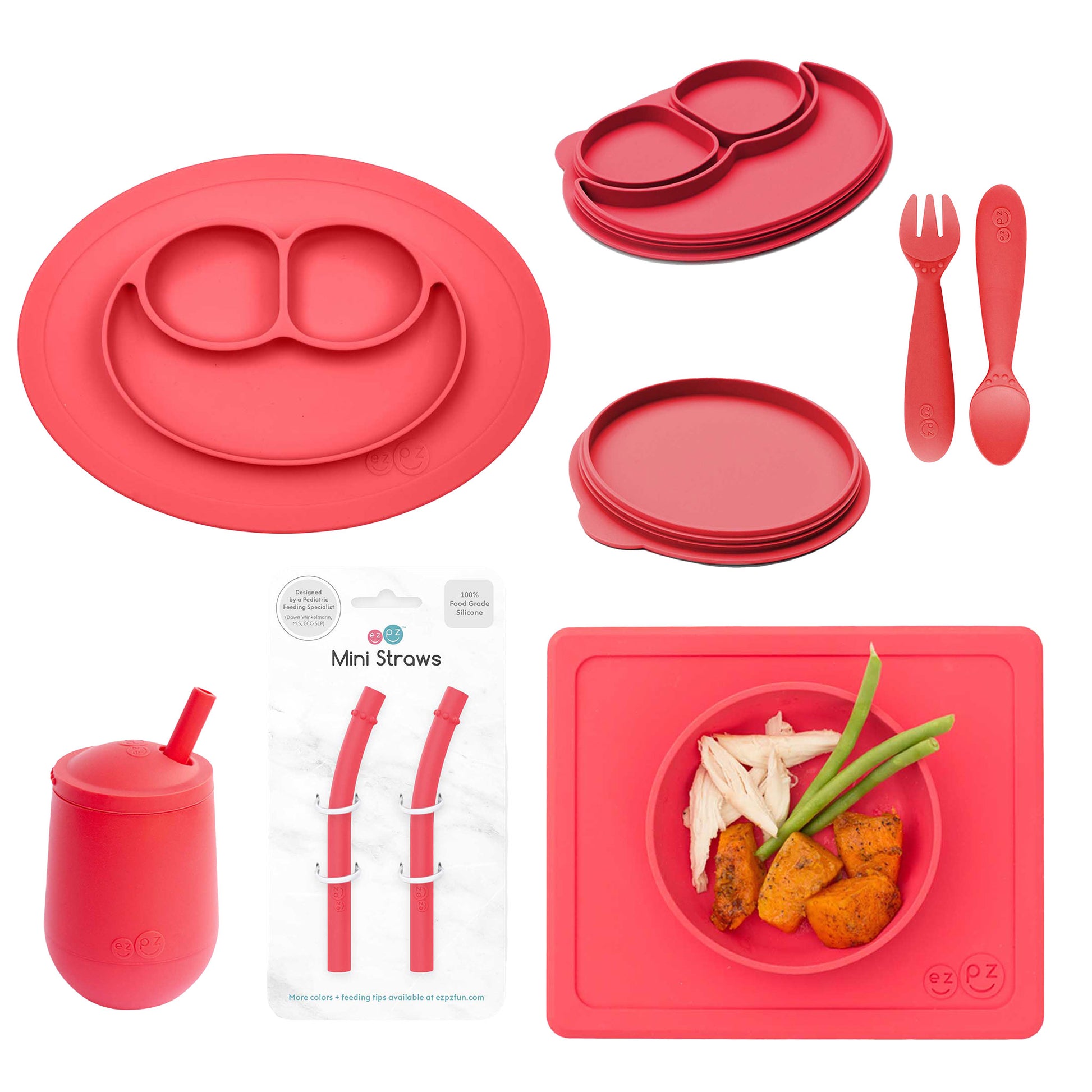 Now that your little one is eating and drinking, it’s time to refine those self-feeding skills. This next-stage bundle supports practice, control, and independence at mealtime — helping your child transition from beginner to confident eater. This bundle includes the ezpz Mini Mat, Mini Bowl, Mini Cup + Straw Training System, Mini Utensils, and matching lids for both the Mini Mat and Mini Bowl. Each tool is perfectly sized for toddlers learning to scoop, dip, and drink with less mess and more success.